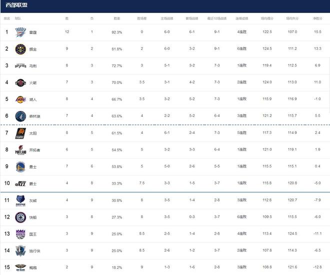 2025-26赛季NBA常规赛赛程不知不觉已经过去了1/7赛程。经历过休赛期大洗牌后,本赛季的NBA有惊喜,有失望。西部联盟这边雷霆继续一枝独秀,哪怕开赛以来一直是残阵状态,但无碍他们依旧打出了12胜1负的完美开局,掘金休赛期化整为零后实力提升一大截,头号强援约翰逊迟迟没有融入球队,但无碍他们9胜2负攻防两端与上赛季相比提升巨大。年轻的马刺一波5连胜开局直接创造了队史纪录,要知道这可是GDP组合都无法做到的事情,火箭队经历过开赛短暂低迷后迅速磨合成功兑现阵容天赋。而太阳、开拓者这些年轻球队同样打出了超预期表现,反观勇士、快船、独行侠这三支被寄予厚望的球队没有打出该有的表现。