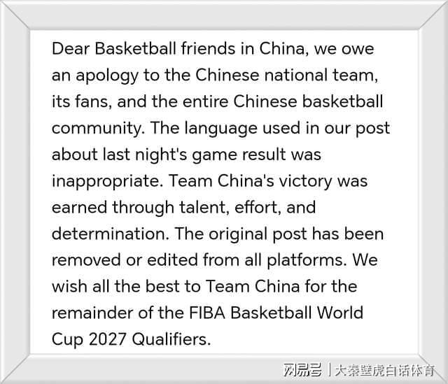 “亲爱的中国篮球球迷朋友们,我们谨向中国国家队、中国球迷以及整个中国篮球界致歉。
