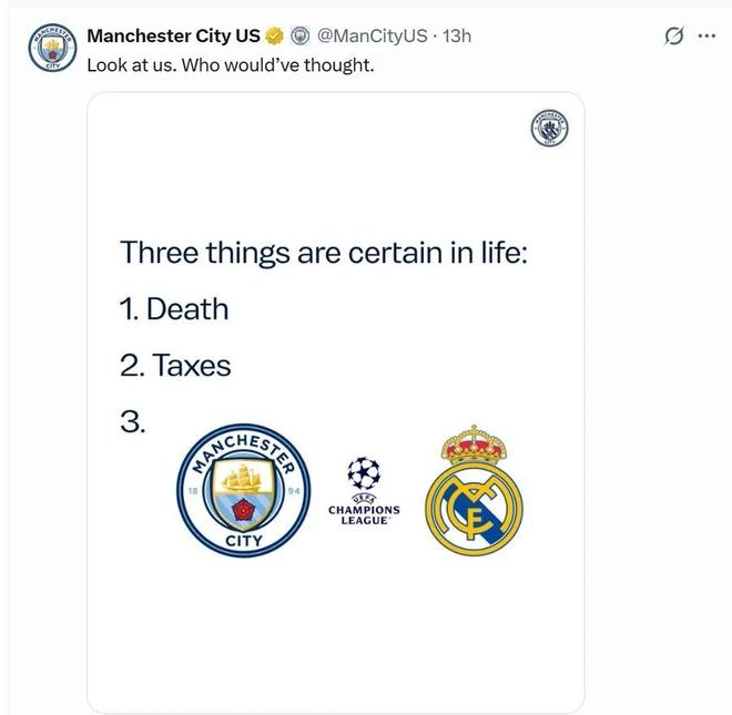 在这之前,本赛季欧冠淘汰赛抽签仪式刚刚结束,曼城将与皇马展开两回合较量,争夺一张通往八强的门票。而这已经是2021/22赛季以来,两队连续5个赛季在欧冠狭路相逢。“唯死亡和税收不可避免。”这是美国开国元勋本杰明富兰克林的话,而曼城官媒加上了对阵皇马,就是在感叹连续5个赛季与这个对手在欧冠交手是有多荒诞。